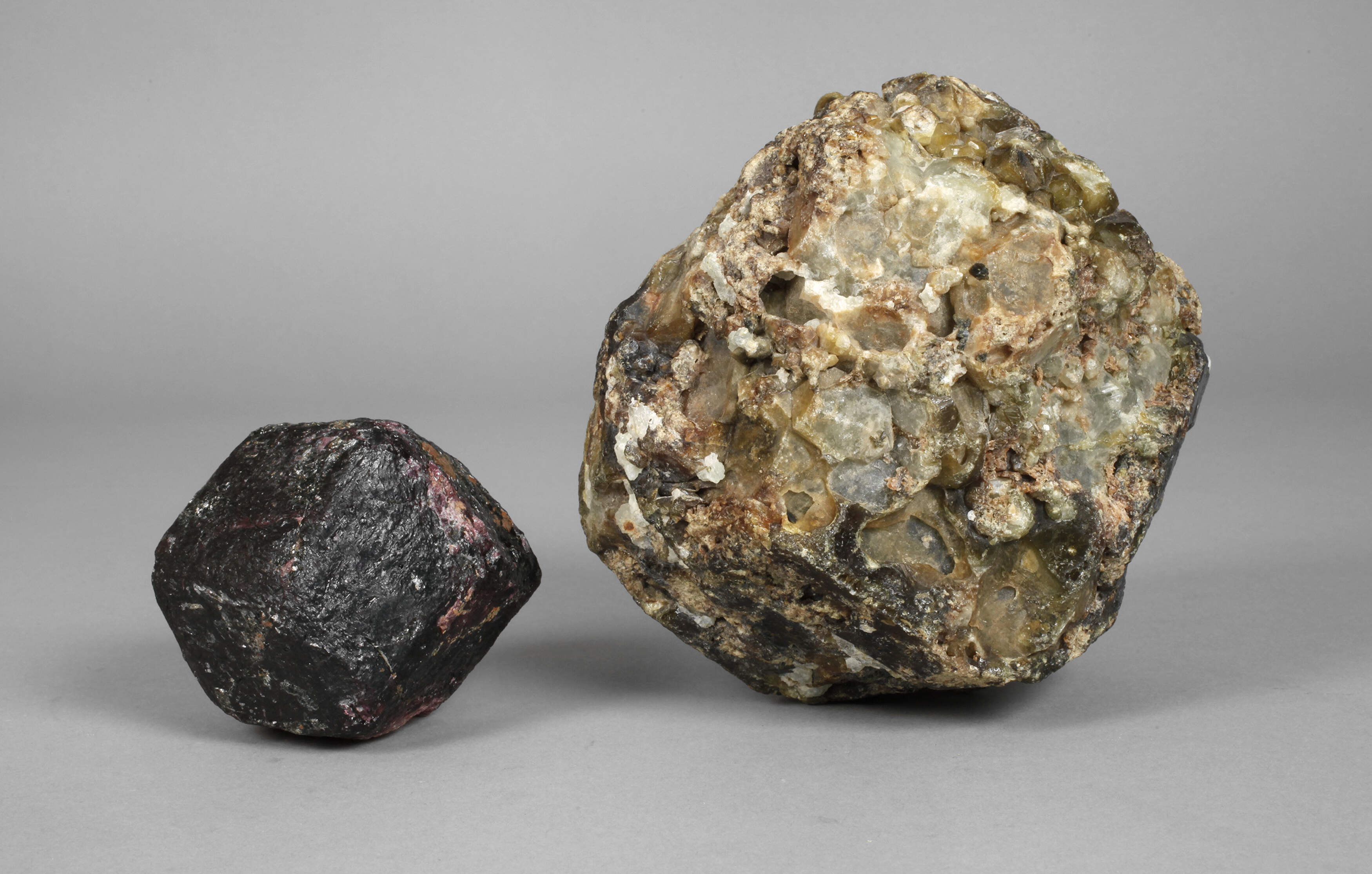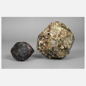 unbestimmten Alters, kompakte Stufen von Hessonit und Grossolar, gute Erhaltung, L 14 und 9 cm.