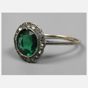 2. Hälfte 19. Jh., Gelbgold geprüft 333/1000 und Silber, runder Ringkopf, besetzt mit grünen facettierten Steinen, umgeben von zahlreichen klaren Schmucksteinen, Tragespuren, RW 18 mm, G ca. 2,1 g.