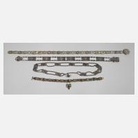 um 1900, Metall versilbert, drei durchbrochen gearbeitete Gürtel mit plastisch gestalteter Oberfläche, L max. ca. 105 cm sowie Historismuscollier, aufwendig durchbrochen gearbeitet und partiell vergoldet, besetzt mit verschiedenen Glassteinen und Kunstperlen, L ca. 47 cm, jeweils mit Tragespuren.