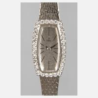 um 1960, Weißgold gestempelt 0,750, längliches tonnenförmiges Gehäuse von 30 x 16 mm, mit Brillantlünette von zusammen ca. 0,75 ct, Ziffernblatt mit Indizes und Schriftzug "Ebel", mechanisches Werk läuft an, integriertes, sich verjüngendes Band, sehr gut erhalten, L ca. 19 cm, G ca. 37,6 g.