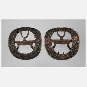 1. Hälfte 18. Jh., Eisen partiell farbig gefasst, verziert mit Zopfmuster, rückseitig mit Stoff gefüttert, kleinere Verluste, Stoff teils verschlissen, Maße je ca. 52 x 50 mm, im originalen Etui mit Papierprägung.