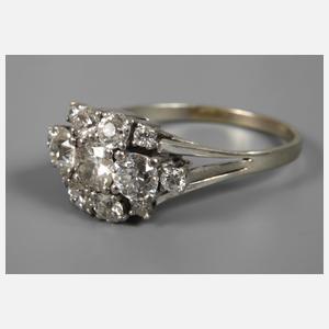 um 1920, Weißgold gestempelt 585, besetzt mit fünf Altschliffdiamanten sowie acht Brillanten, Gesamtgewicht der Steine ca. 2,5 ct, jeweils gefasst in Krappenfassung, minimale Tragespuren, RW 19 mm, G ca. 5,5 g.