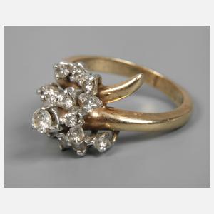 Ende 20. Jh., Weiß- und Gelbgold, gestempelt 14 K = 585 und Everbrite, Ringkopf besetzt mit 15 Brillanten in Krappenfassung von zusammen ca. 0,4 ct, minimale Tragespuren, RW 16 mm, G ca. 5 g.
