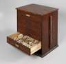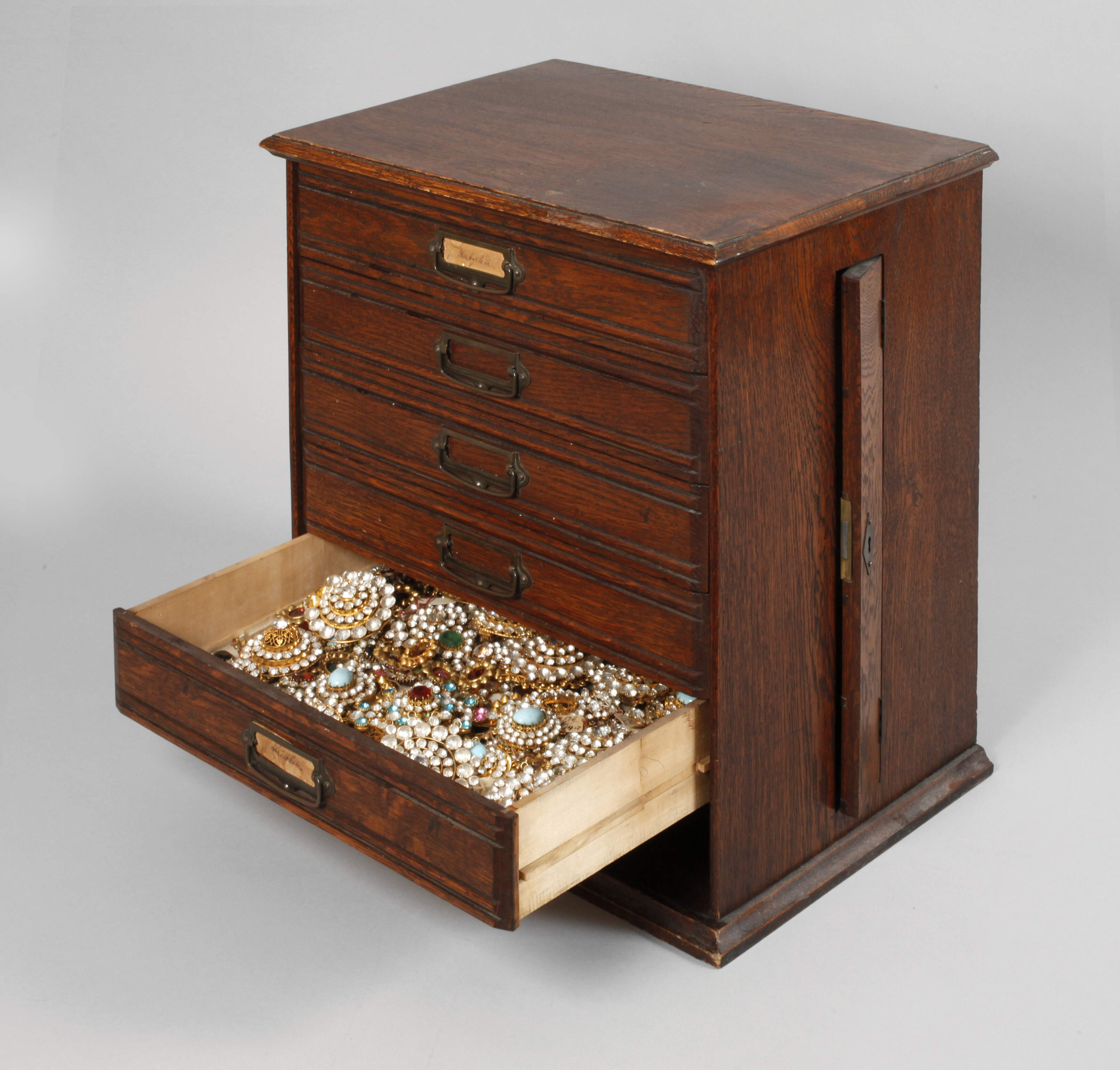Holzkästchen, um 1920, mit fünf von sechs Schüben, schätzungsweise 200-300 Modeschmuckstücke wie Orden, Broschen, Anhänger, Gürtelschließen und Applikationen, teils mit alten Nummern versehen, meist mit üppigem Steinbesatz, unterschiedliche Erhaltung, Maße Kasten ca. 47 x 44 x 31 cm.