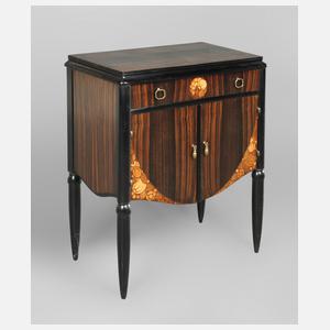 Frankreich, 1920er Jahre, in Makassar furnierter Korpus mit geometrischen Einlegearbeiten in verschiedenen Edelhölzern, partiell ebonisiert, Korpus mit Schubkasten und zwei Türen, innen Regaleinteilung, normale Alters- und Gebrauchsspuren, Maße 82 x 66 x 36 cm.