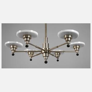 1930er Jahre, Schwintzer + Gräff Berlin, schlankes verchromtes Metallgestänge, sechs sternförmig montierte kurze Leuchterarme, jeweils eine getreppte Lampenfassung sowie eine Schale aus Milchglas tragend, H ca. 100 cm, D ca. 65 cm.
