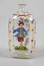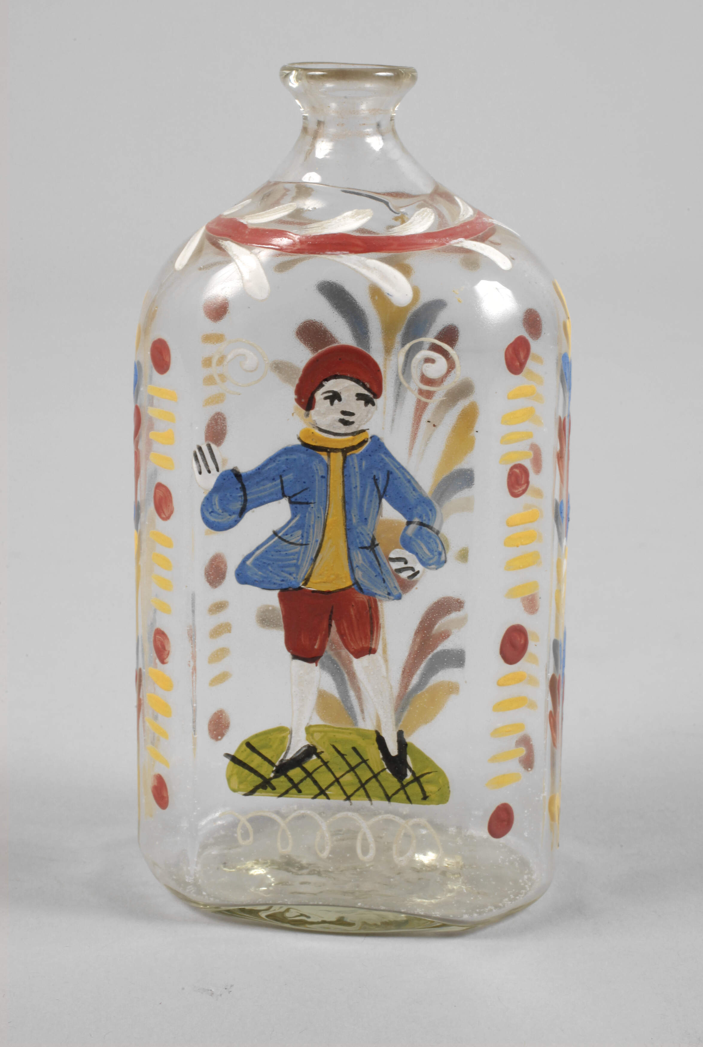 Süddeutsch, um 1800, farbloses Glas, blasiger Abriss, flache Form, angesetzter Hals, polychrome Emaillebemalung, schauseitig ein Edelmann, rückseitig und an den Seiten ornamentaler Floraldekor, guter Zustand, ohne Stopfen, H 13 cm.