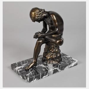 20. Jh., Bronze dunkel patiniert, nach dem Vorbild des „Kapitolinischen Dornausziehers”, Kopie eines späthellenistischen Originals, ausgestellt im Konservatorenpalast in Rom, nackter Jüngling, auf einem Felsen sitzend und einen Dorn aus seinem Fuß ziehend, auf langrechteckiger Plinthe, Patina partiell berieben, H Bronze 20 cm, H gesamt 24 cm.