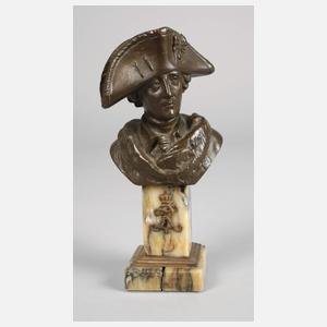 1. Hälfte 20. Jh., unsigniert, verso Gießereimarke "Werkstätte für Bronzebildguss RBK Bronze Garantie" (Robert Kionisek Berlin), Bronze braun patiniert, der volkstümlich als der ”Alte Fritz” bezeichnete König von Preußen und Kurfürst von Brandenburg als Brustbild in Uniform mit Dreispitz und mit Mantel, auf mehrteiligem Onyxsockel mit appliziertem bekrönten Friedrich-Rex-Monogramm, Sockel gerissen und geklebt, H Büste 9,5 cm, H gesamt 16,5 cm.