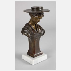 1. Drittel 20. Jh., unsigniert, Bronze nuanciert dunkelbraun patiniert, Brustdarstellung einer jungen Frau, wohl in süddeutscher (Chiemgauer?) Tracht, mit zum Kranz geflochtenem Haar, weitem Hut, Bluse und geschnürtem Mieder, auf hellem Marmorsockel, dieser mit winzigsten Blessuren, H Bronze 20 cm, H gesamt 23 cm.