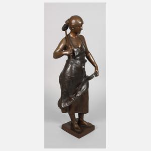 datiert 1879, signiert, Gießerstempel Akt. Gesellschaft vorm. H. Gladenbeck & Sohn, Bronze braun patiniert, Frau in Schürze und Rock mit Zahnrad und großem Hammer als Metallarbeiterin, barfuß auf kleiner quadratischer Plinthe stehend, kleiner Haarriss an der Plinthe, sonst altersgemäß gut erhalten, H gesamt 74 cm. Künstlerinfo: deutscher Bildhauer und Medailleur (1856 Köln bis 1930 Berlin), Lehre zum Steinmetz in Köln, ab 1874 an der Münchener Kunstakademie, danach bei Heinrich Hoffmeister in Berlin, 1878 Studium in Berlin bei Fritz Schaper, unterrichtete seit 1896 als Professor für Bildhauerei an der Kunstakademie Berlin-Charlottenburg, der heutigen Akademie der Künste, ab 1898 Mitglied der Königlichen Akademie der Künste, 1894 kleine Goldmedaille auf der Großen Berliner Kunstausstellung, 1897 große Goldmedaille. Quelle: Internet.