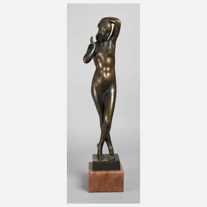 um 1930, auf der Plinthe signiert, stehende nackte Schönheit mit langem Haar, auf quadratischer Plinthe, auf Marmorsockel montiert, zaponiert, Patina partiell berieben und mit stärkeren Altersspuren, H Bronze 53,5 cm, H gesamt 61 cm. Künstlerinfo: ungarischer Bildhauer (1897 bis 1979) studierte unter Ferenc Sidló an der Akademie der bildenden Künste, nach dem 1. Weltkrieg als Industriekünstler in Deutschland tätig, 1930 Preis der Jury der Szinyei-Gesellschaft, war Mitglied der Munkácsy-Gilde, 1932 erhielt er den Henrik-Biró-Preis im Nationalen Salon, 1933 Lob beim Ferenc-József-Jubiläumspreiswettbewerb, 1943 Preis der Vereinigung bildender Künstler auf der Frühjahrsausstellung des Műcsarnok, seine Werke werden in der Ungarischen Nationalgalerie ausgestellt. Quelle: Internet.