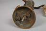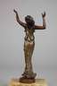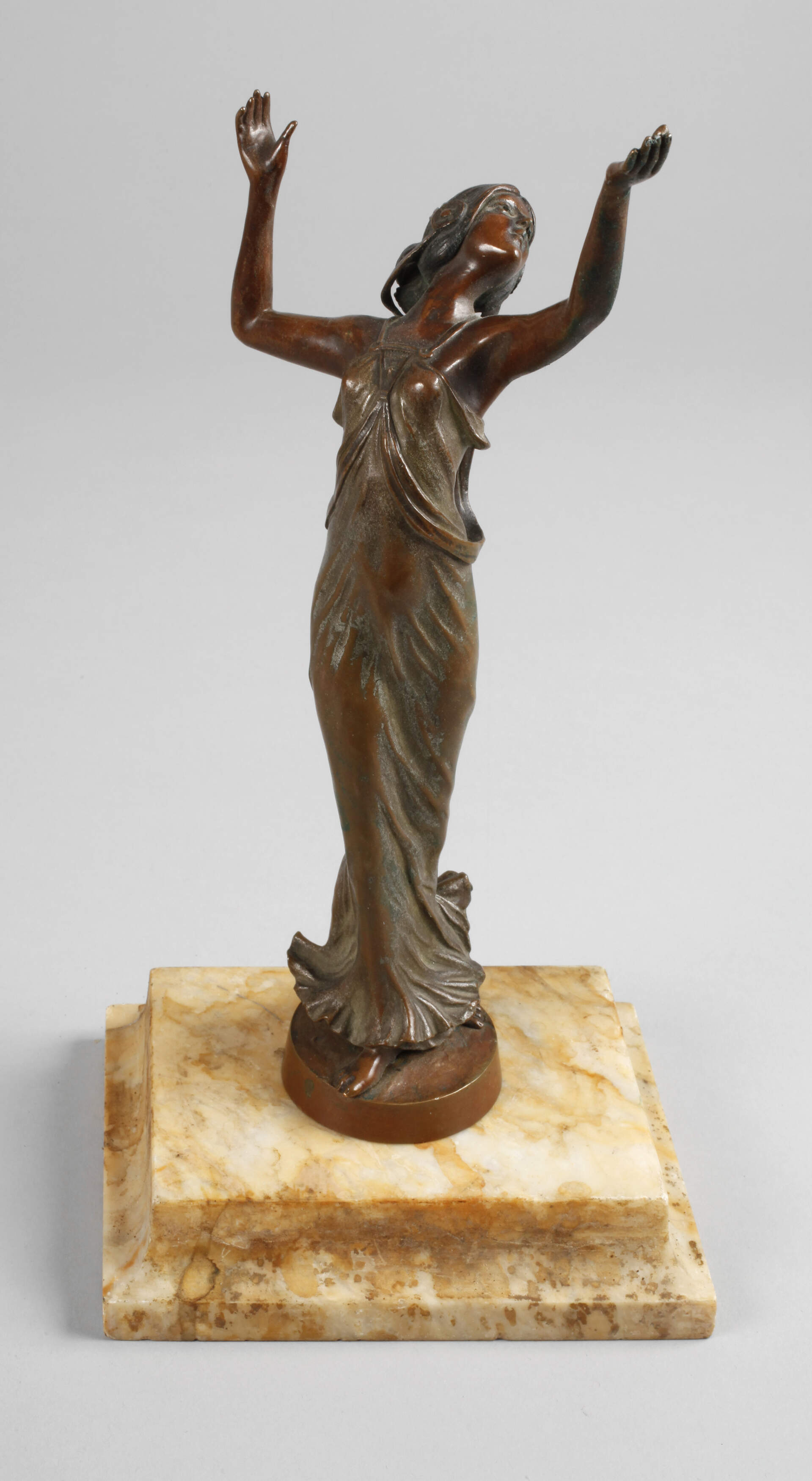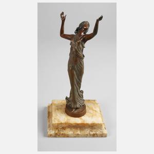 um 1915, unsigniert, Bronze polychrom, teils in Kaltbemalung patiniert, mit erhobenen Armen tanzende junge Frau mit Haarknoten und Haarbändern mit großen Ornamentdekorationen, auf kleiner runder Plinthe, lose auf Marmorsockel gesteckt, Patina mit stärkeren Altersspuren und Bereibungen, teils grünspanig, ein Finger verdrückt, H Bronze 24,5 cm, H gesamt 26,5 cm.