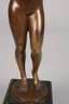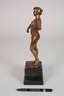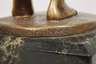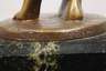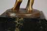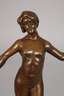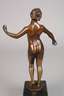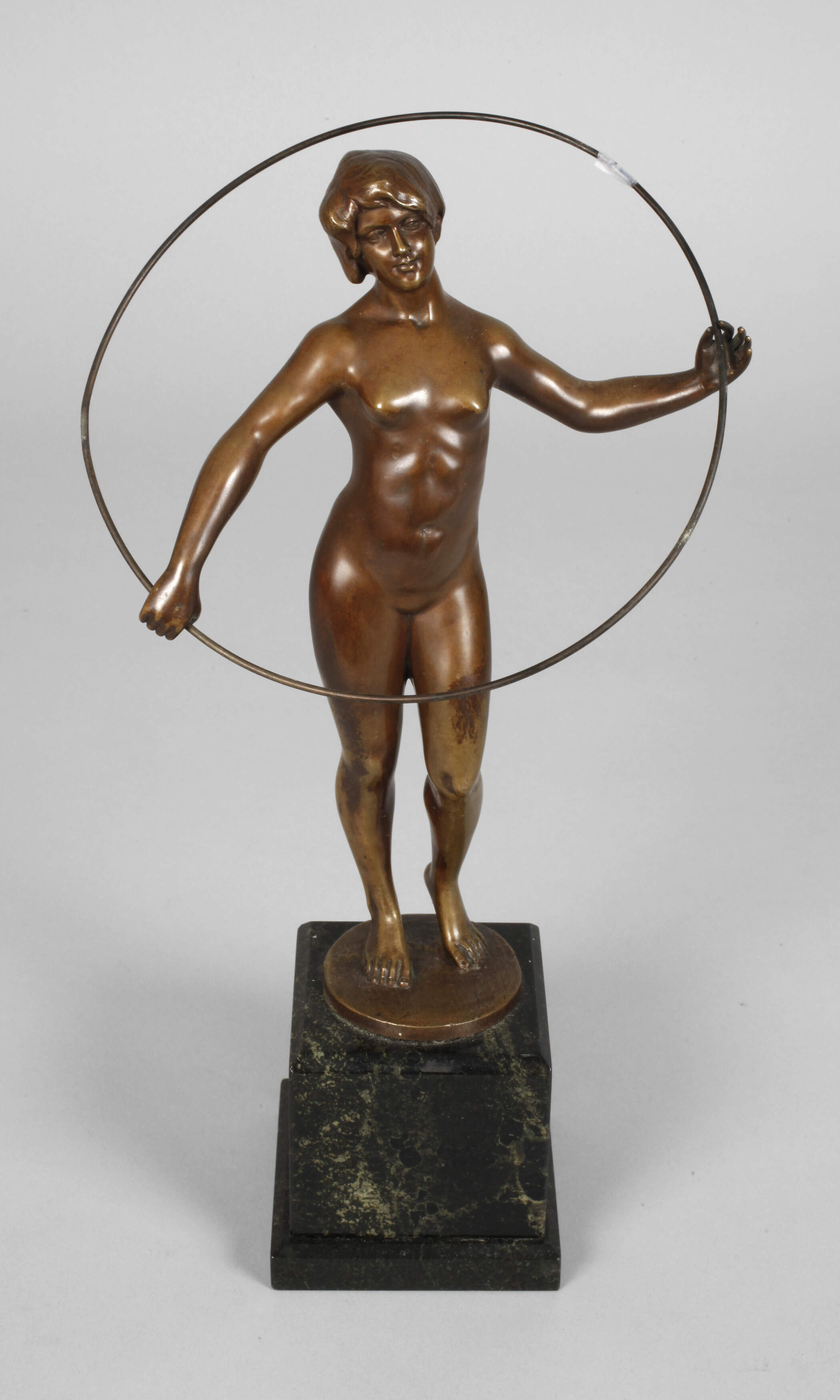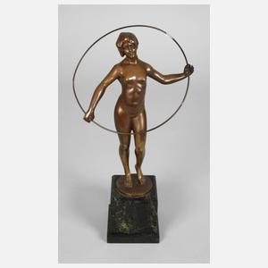 um 1900, verso undeutlich signiert S. Schwatenberg, Bronze braun patiniert, weiblicher Akt in verträumter tänzerischer Pose, einen großen Reif in den Händen balancierend, auf kleiner runder Plinthe, auf mehrteiligen Sockel aus Granatserpentin montiert, Altersspuren, Reif nicht mehr geschlossen, H Bronze 23,5 cm, H gesamt 31 cm. Künstlerinfo: deutscher Bildhauer, wohl tätig um 1989–1921. Quelle: Internet.