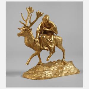 1. Hälfte 19. Jh., unsigniert, Bronze ziseliert und feuervergoldet, auf einem Hirsch sitzende Tangermünder Jungfrau, die sich der Sage nach im Wald verirrte und von dem Hirsch gerettet wurde, im mittelalterlichen Gewand mit Haube und feinem Faltenwurf, im Damensitz auf dem imposanten Hirsch reitend, auf naturalistisch gestalteter Plinthe, am Bauch des Hirsches etwas Grünspan, minimalst berieben, H 17 cm.