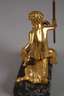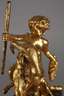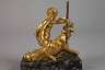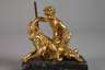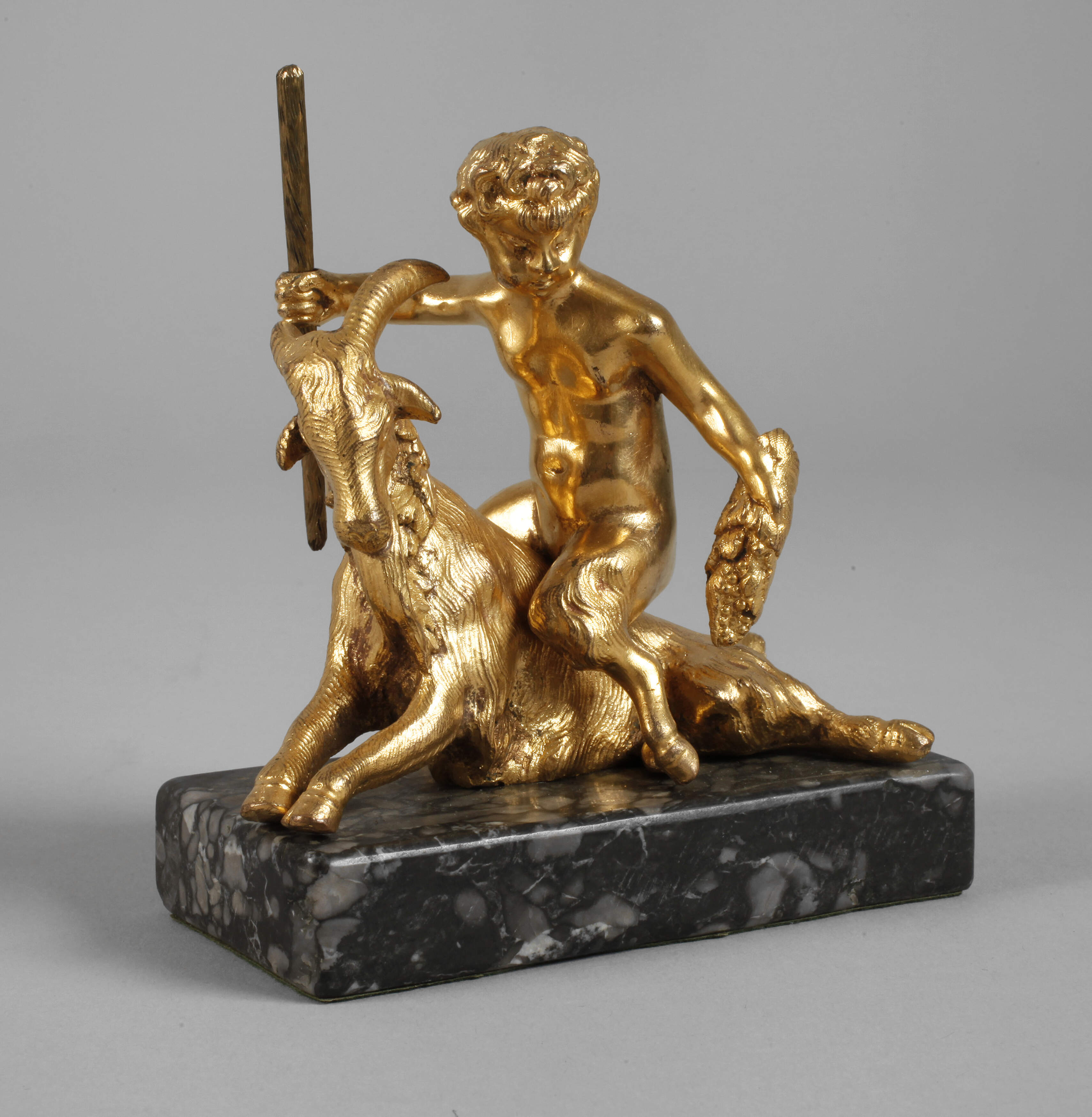 19. Jh., unsigniert, Bronze vergoldet, mit Thyrsosstab und Weinrebe auf einem Ziegenbock thronender Satyr mit Bocksbeinen, auf dunklen Marmorsockel montiert, ein Bein des Satyr mit kleinem Haarriss, H Bronze 10,3 cm, H gesamt 12 cm.