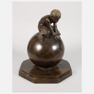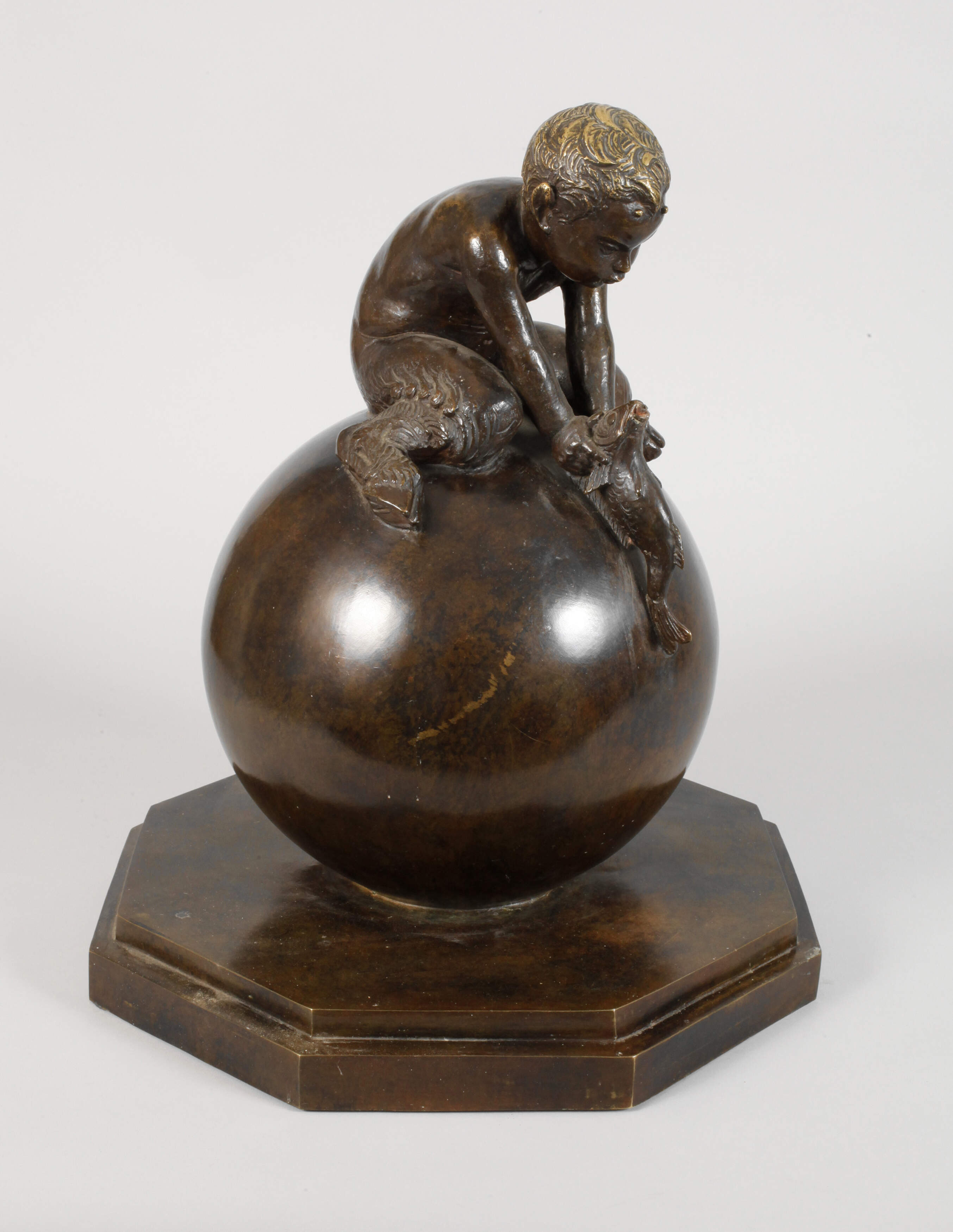 1. Hälfte 20. Jh., signiert, Gießerstempel Susse Frs Fondrs Paris sowie weitere Schriftzüge, Cire Perdue, Bronze sowie Cire retouchée par l'auteur, Bronze braun patiniert, auf oktogonaler, getreppter Plinthe ruhende große Kugel, darauf ein Faun mit einem Fisch sitzend, der Fisch mit Wasserauslass, innen mit Schlauch zur Wasserleitung, altersgemäß gut erhalten mit leichten Gebrauchsspuren, H 51 cm. Künstlerinfo: französischer Bildhauer (1884 Toulouse bis 1976 Ivry-sur-Seine), war der Sohn eines Zimmermanns, studierte ab 1905 an der Pariser Schule der Schönen Künste unter Antonin Mercié und Antonin Carlès, gewann zahlreiche Preise, darunter auch den großen Rompreis, ab 1921 stellte er regelmäßig im Salon der französischen Künstler, erhielt ein Ehrendiplom der Gesellschaft französischer Künstler für die Internationale Ausstellung für Kunst und Technik von 1937 in Paris (für seine vier Stelen, die die Fassade des Languedoc-Pyrénées-Pavillons schmücken), 1906 zum Ritter der Ehrenlegion ernannt. Quelle: Wikipedia Frankreich.