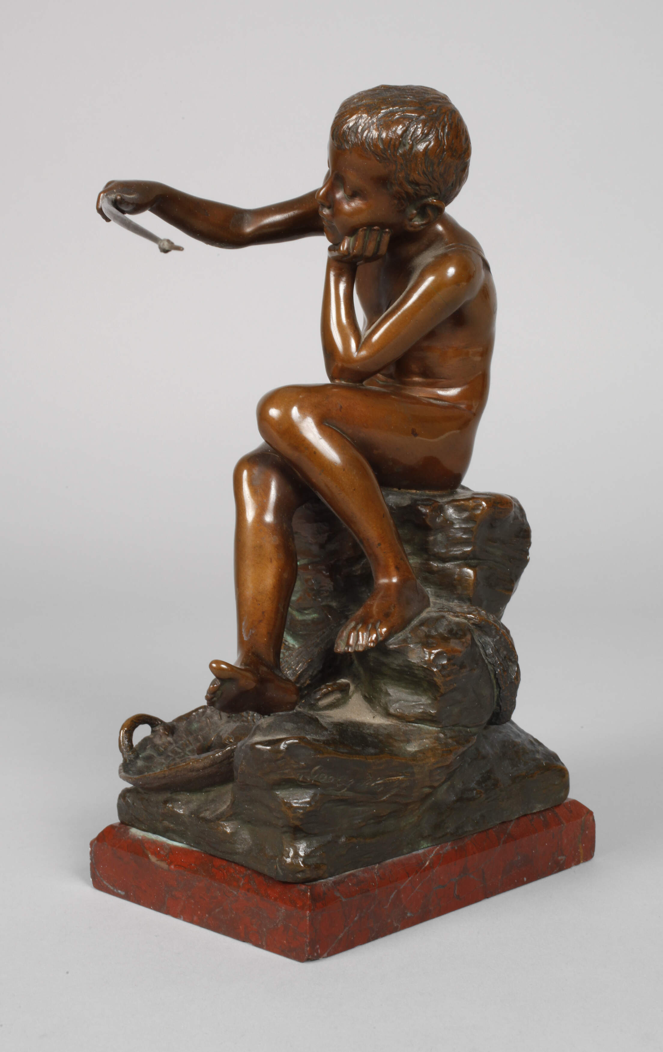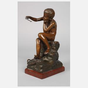 Anfang 20. Jh., am Felsen signiert Georg Wolf., Gießerstempel Aktien-Gesellschaft vorm. A. Gladenbeck u. Sohn., Bronze dunkelbraun patiniert, auf einem Felsen sitzender Fischerjunge mit Angel und umgehängtem Köderbeutel, zu seinen Füßen sein Netz und Korb mit gefangenen Fischen, auf Marmorsockel montiert, Angelrute etwas verbogen und Sockel mit winzigsten Kerben, sonst altersgemäß gut erhalten, H Bronze 23 cm, H gesamt 24,5 cm. Künstlerinfo: Bildhauer (1858 San Francisco bis 1930 Berlin), studierte zuerst Architektur an den Hochschulen in Wien und München, dann Bildhauerei an der Berliner Akademie unter Fritz Schaper, war ansässig in Charlottenburg, beschickte die Große Berliner Kunstausstellung. Quelle: Thieme-Becker, Vollmer, Allgemeines Lexikon der Bildenden Künstler, Verlag Seemann Henschel GmbH & Co. KG.