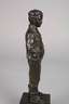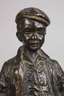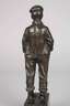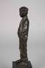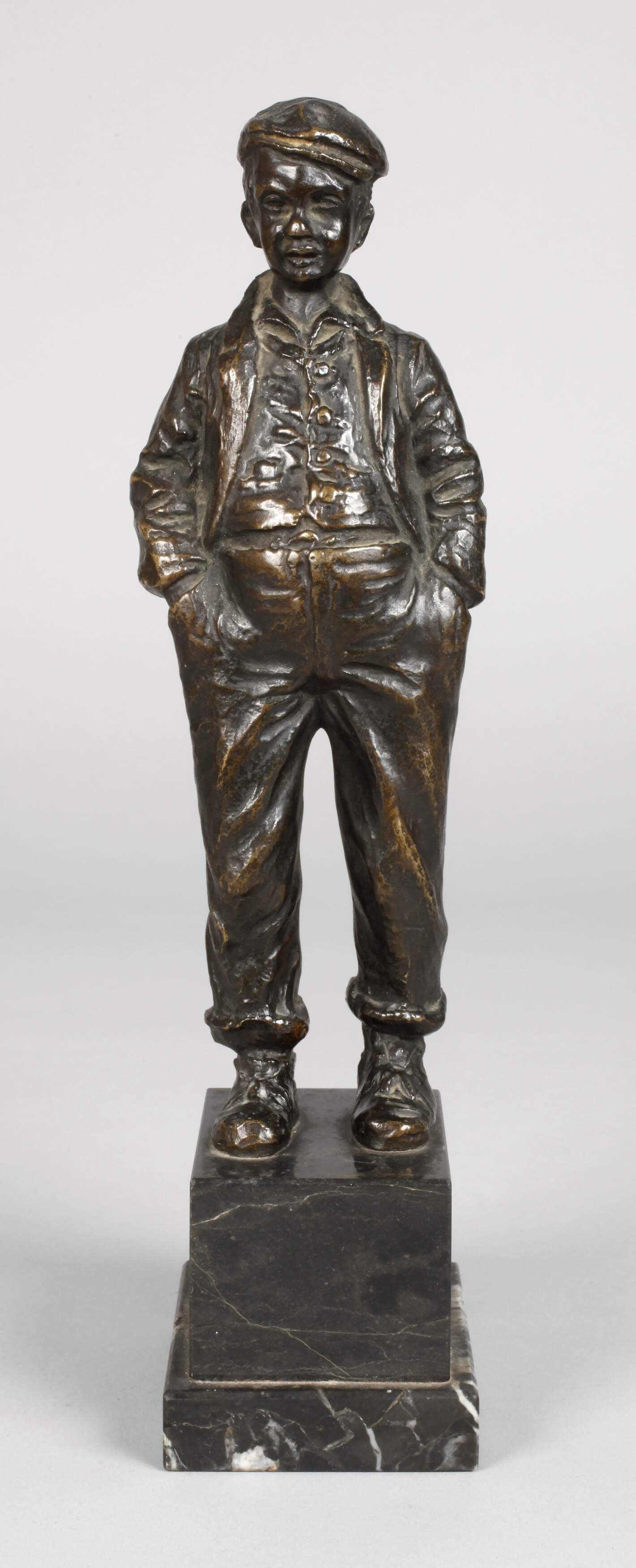 1920er Jahre, unsigniert, Bronze dunkel patiniert, junger Mann der Arbeiterklasse mit groben Schuhen und mit Schiebermütze, die Hände tief in den Hosentaschen vergraben, auf mehrteiligem dunklen Marmorsockel, altersgemäß gut erhalten, H Bronze 21 cm, H gesamt 27 cm.