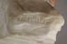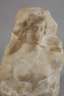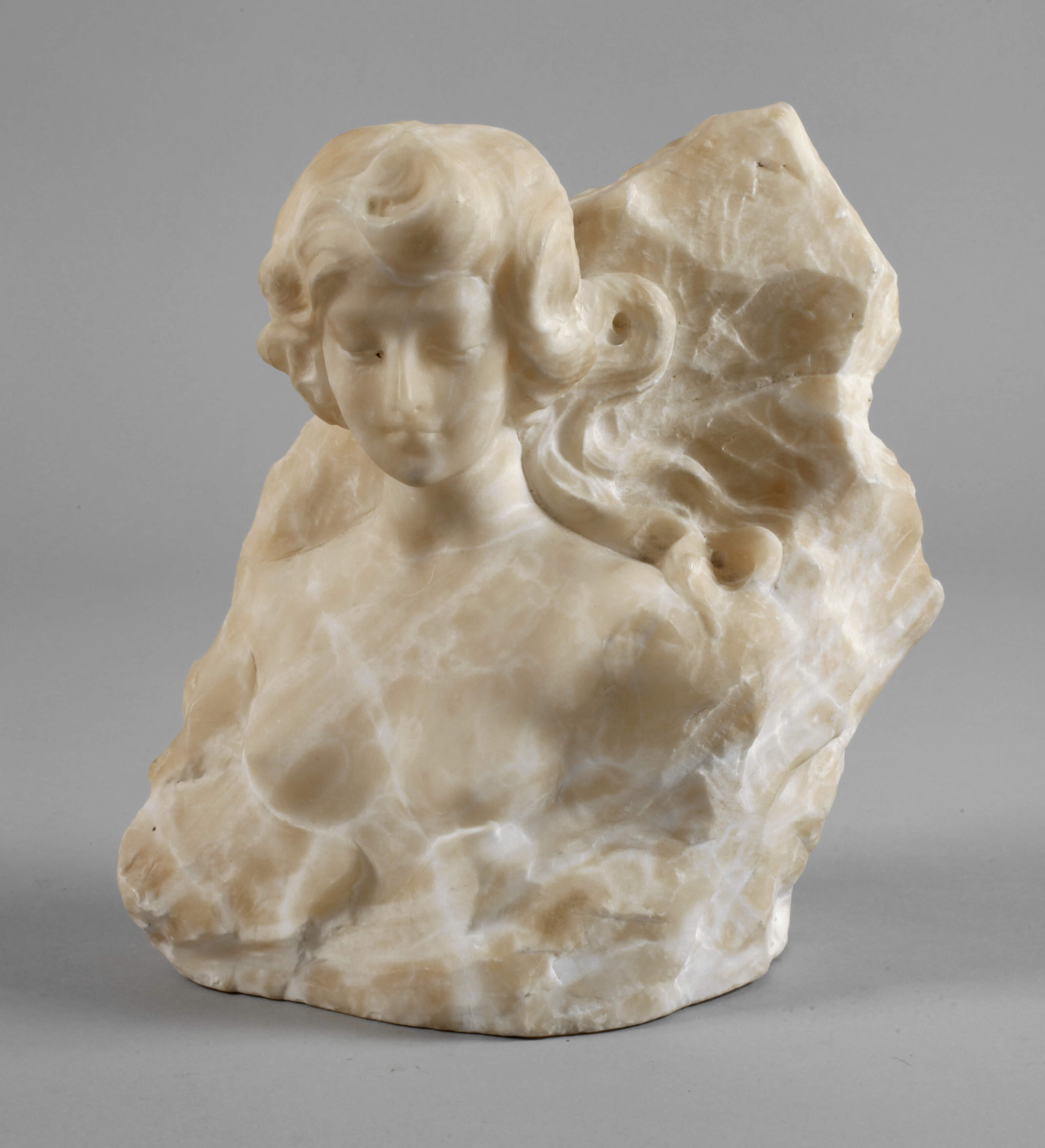 deutsch, um 1900, seitlich signiert A. Müller, Alabaster hell marmoriert, Brustdarstellung einer nackten jungen Frau mit offenem Haar, Darstellung als Torso an einem Felsen, winzige Kerben, sonst gut erhalten, H 21 cm.