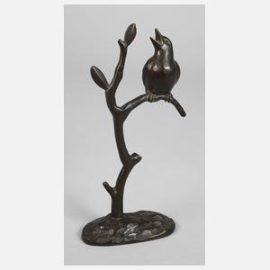 um 1920, am unteren Astende monogrammiert RP, Bronze dunkel patiniert, auf kargem Ast sitzendes kleines Vögelchen mit geöffnetem Schnabel, gute Erhaltung, H Bronze 20,5 cm. Künstlerinfo: österreichischer Maler, Plastiker und Holzschneider (1894 Wien bis 1945 Swinemünde), studierte bei Henry van de Velde und Gottlieb Elster an der Kunstschule Weimar, weitergebildet in München, betrieb als Graphiker eigenen Verlag, arbeitete vorwiegend als Entwerfer für Porzellanplastik, unter anderem für Rosenthal, Hutschenreuther, Heubach, Fraureuth, Lichte und die Schwarzburger Werkstätten, tätig in Berlin, Quelle: Thieme-Becker, Vollmer, Allgemeines Lexikon der Bildenden Künstler, Verlag Seemann Henschel GmbH & Co. KG.