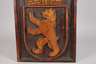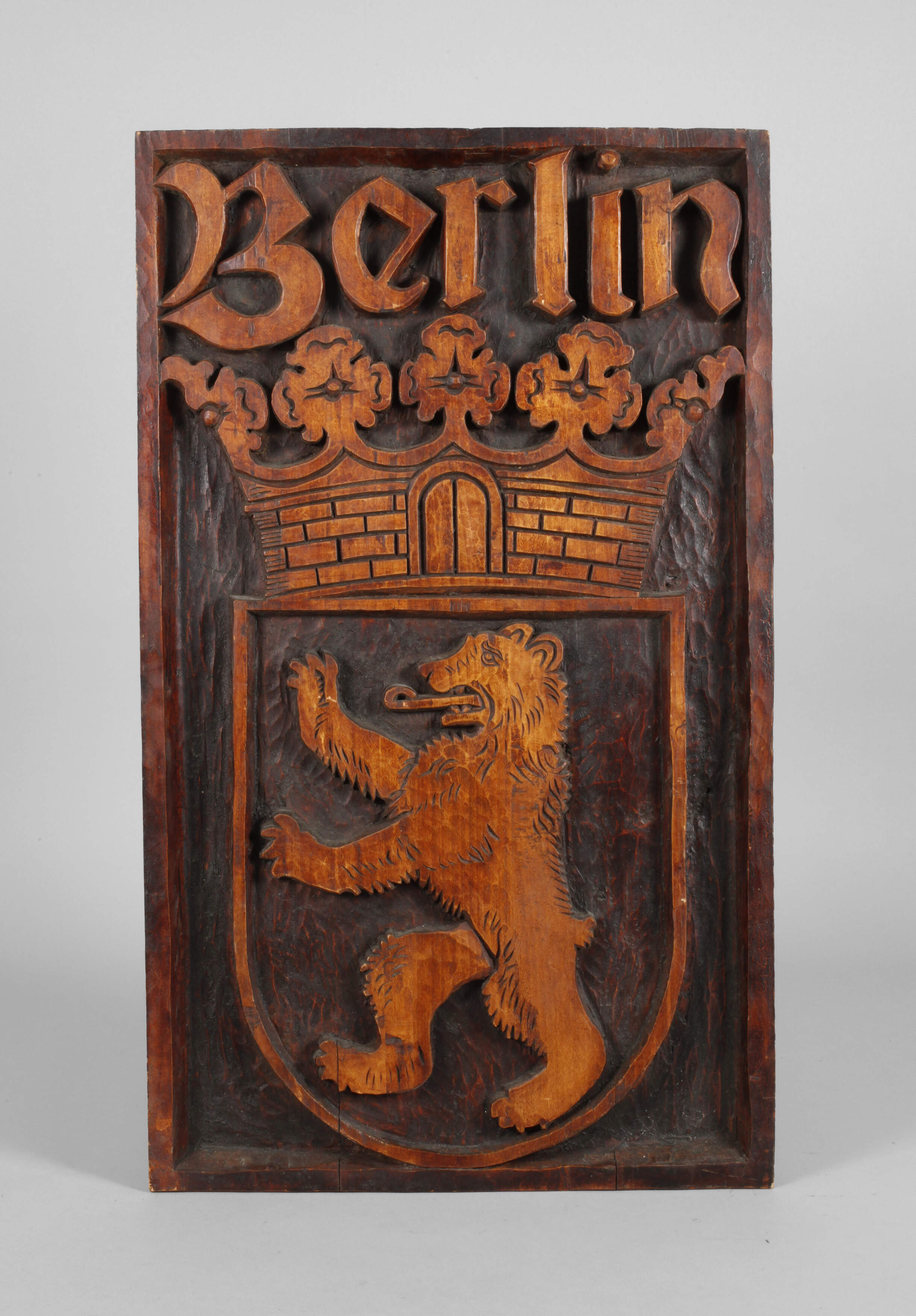 wohl 1930er Jahre, ungemarkt, Lindenholz geschnitzt, dunkel gefasst, im Hochrelief gearbeitete Darstellung mit bekröntem Wappenschild und Umschrift, gute Erhaltung, Maße 74 x 45 cm.