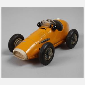um 1950, gemarkt, bezeichnet und Zusatz Made in U.S. Zone Germany, Blech gelb lackiert und Nickelverzierung, Ferrari-Rennwagen mit intaktem Uhrwerkantrieb, Lenkradsteuerung, Handbremse, klappbarer Windschutzscheibe, montierbaren Rädern und Gummibereifung, unbespielter Zustand mit Altersschwund am Anstoßdämpfer, L 16 cm.