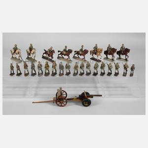 1930er Jahre, tlw. gemarkt Elastolin, Lineol, Durolin, Strola und Schusso, Blech mimikry und Masse farbig gefasst, bestehend aus Zweispänner mit Protze und Feldgeschütz mit intakter Federspannung, wohl Leyla, sowie vier Soldaten als Besatz, dazu sechs Reiter und ca. 15 Marschsoldaten, bespielter und altersgemäßer Zustand, vereinzelt bestoßen bzw. ein Pferdeschweif geklebt, Figurengröße 7 und 7,5 cm, L Gespann ca. 30 cm.