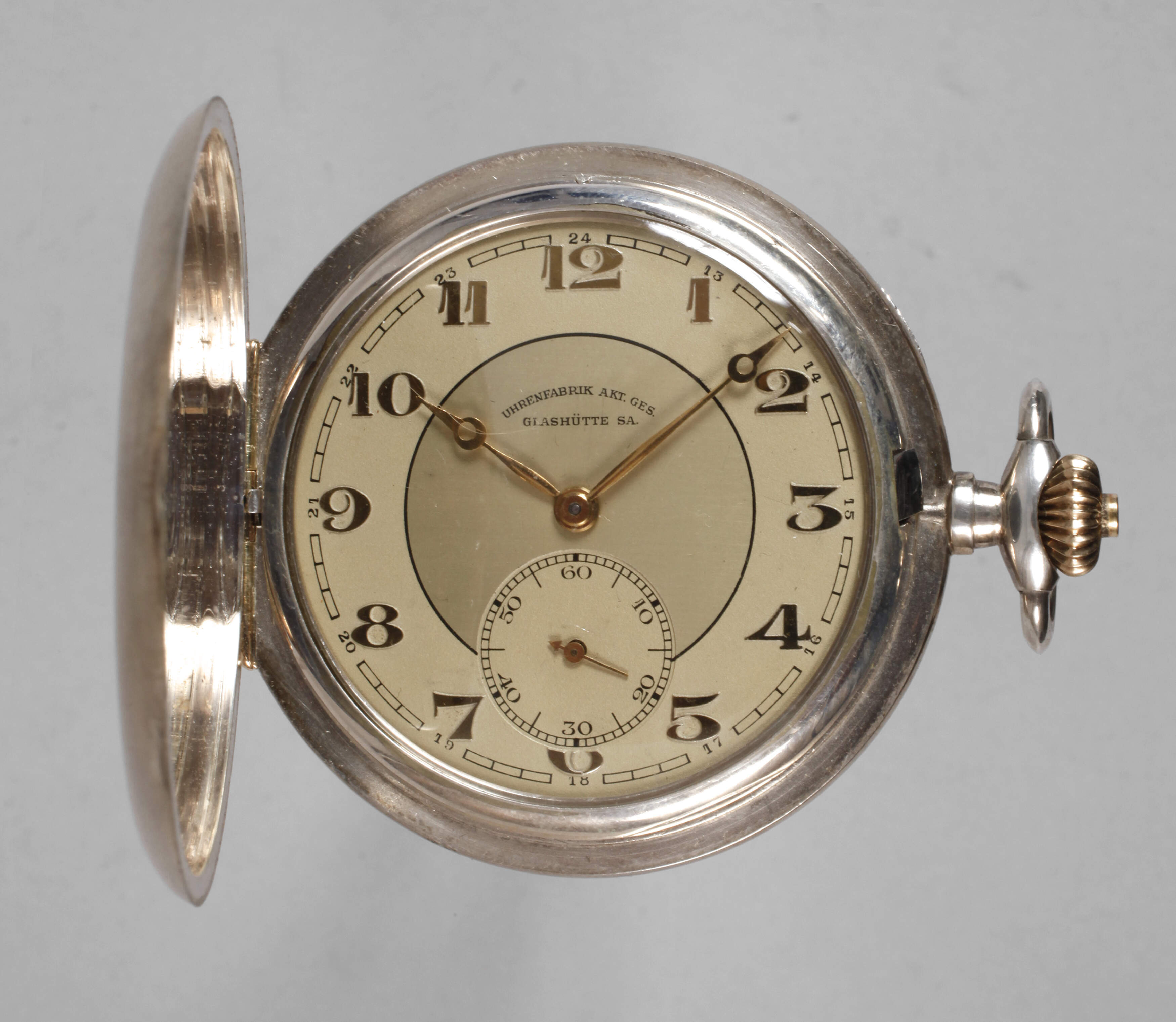 auf Ziffernblatt und Gehäuse gemarkt A. Lange & Söhne Uhrenfabrik, Akt. Gesellschaft, Glashütte SA., um 1920, Werk gestempelt Tutima, Werk-Nr.: 20081, Qualitätswerk mit Glashütter Ankergang, glattes Silbergehäuse gest. 800, vergoldetes Ziffernblatt mit vertiefter Mitte und kleiner Sekunde, Goldzeiger, goldene Scharniere und Krone, läuft einwandfrei, Z 1–2, D 50 mm.