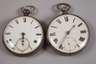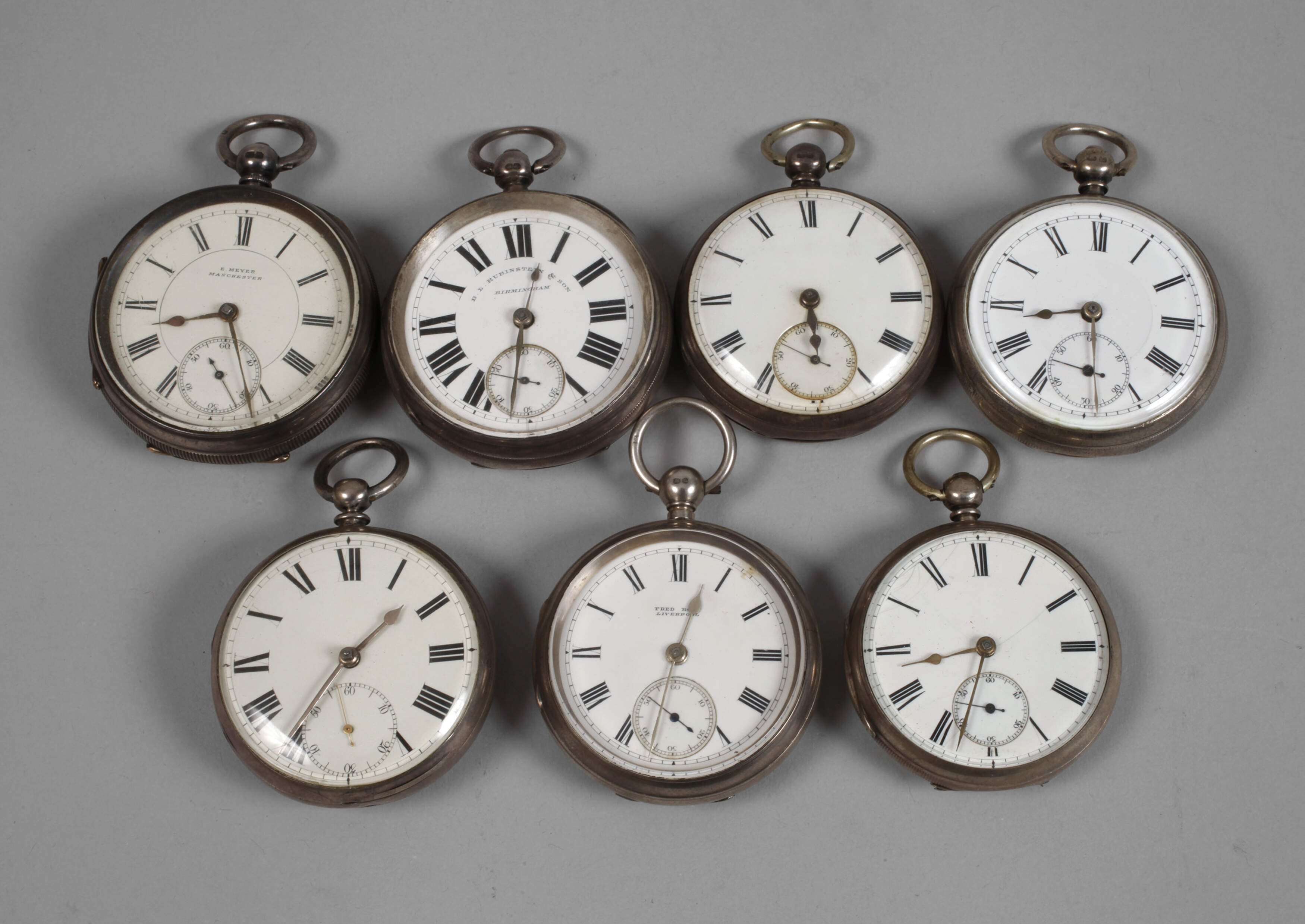 19. Jh., alle im Silbergehäuse, emaillierte Ziffernblätter, gekapselte Werke mit Spitzzahn- bzw. Schweizer Ankerhemmung, Antrieb über Kette und Schnecke, vier Uhren sind funktionstüchtig, unterschiedliche Zustände, tlw. reparaturbedürftig, D ca. 50 mm.