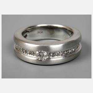 neuzeitlich, Weißgold gestempelt 585, mattierte Oberfläche, mittig besetzt mit einem Brillanten von ca. 0,2 ct, flankiert von insgesamt 20 Kleinstbrillanten, RW 16 mm, G ca. 9,4 g.