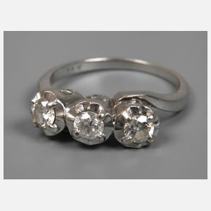 um 1920, Weißgold gestempelt 14 K = 585/1000, besetzt mit zwei Altschliffdiamanten und einem Brillanten im Gesamtgewicht von ca. 0,3 ct, leichte Tragespuren, RW 17 mm, G ca. 3,8 g.
