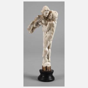 nzl., aus Mammutelfenbein geschnitzt, vollplastische Darstellung eines Paares beim Liebesspiel, auf gedrechseltem flachen Holzsockel, H 17 cm.
