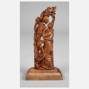 2. Hälfte 20. Jh., aus Mammutelfenbein gefertigtes Reliefbildnis, qualitätvoll beschnitzt und teils durchbrochen gearbeitet, Darstellung nach dem Motiv „Der Tod und das Mädchen“, welches den Sensenmann als Gerippe, eng umschlungen mit einer jungen Schönheit zeigt, auf getrepptem Laubholzsockel, H 15,5 cm.