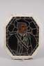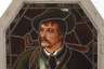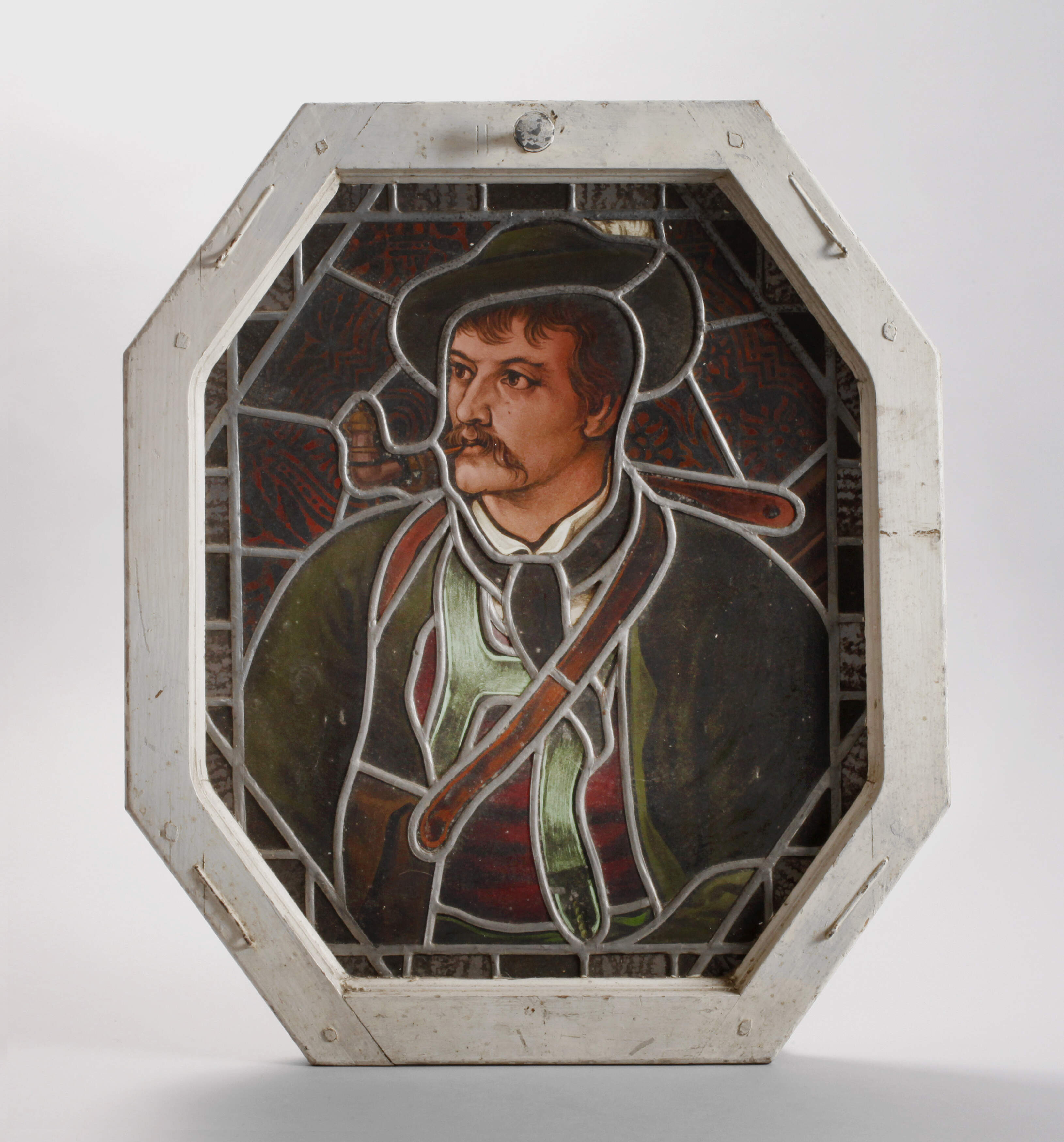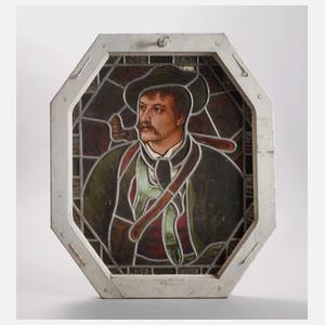 Ende 19. Jh., fein gemalte Darstellung eines jungen Pfeifenrauchers auf Buntglas, im originalen Rahmen, guter Zustand, Maße 59 x 49 cm.