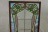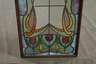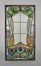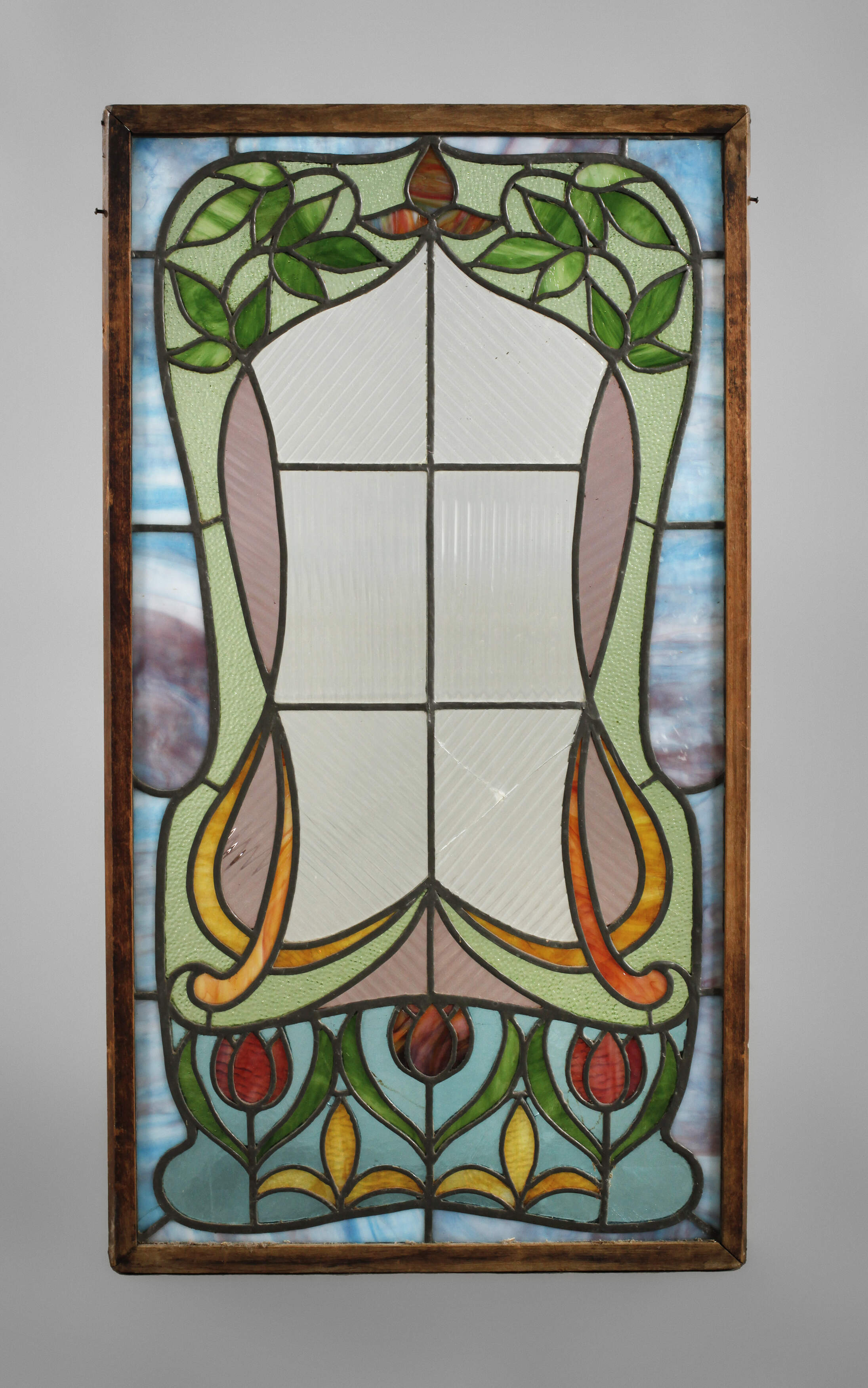 um 1900, stilisierter Floraldekor aus Farb- und Ornamentglas, in originaler Eichenleiste gefasst, ein Segment mit Bruchlinie, Maße 79 x 43 cm.