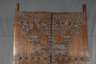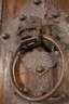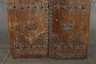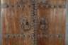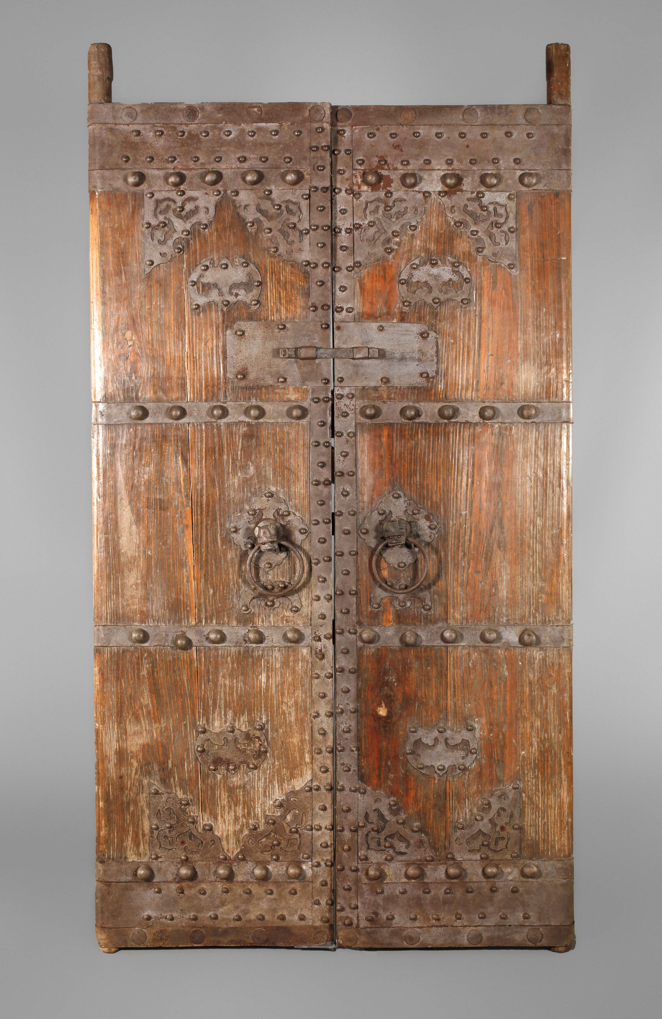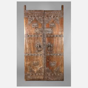 Asien, 18. /19. Jh., aus massivem Hartholz gefertigt, reich mit Eisenbeschlägen verziert, Türgriff in Form eines Hundekopfs, Eisenbeschläge korrodiert, von innen mittels Holzriegel zu verschließen, Holz in gutem Zustand, Maße Türblatt 224 x 63 cm.