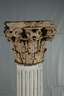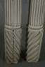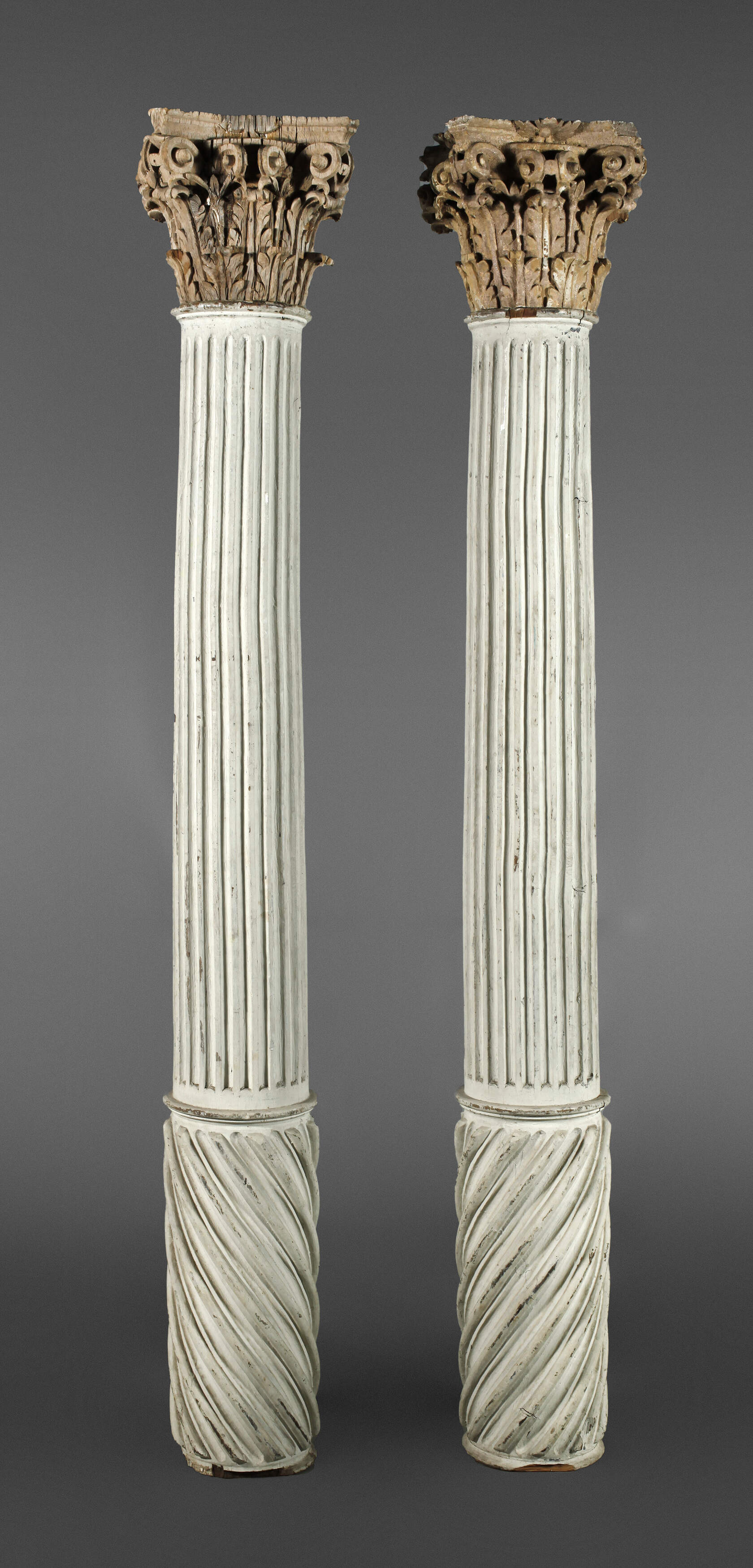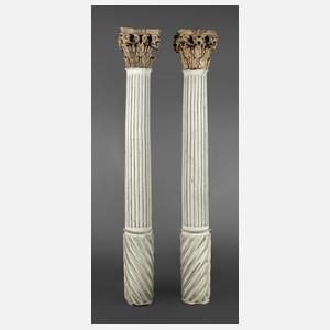 wohl Ende 19. Jh., Hartholz geschnitzt und farbig gefasst, zweiteiliger Korpus, die korinthischen Kapitelle abnehmbar, diese mit Fehlstellen im Schnitzwerk, Holz mit Trocknungsrissen und Farbverlusten, rest.bed., Maße 235 x 35 x 35 cm.