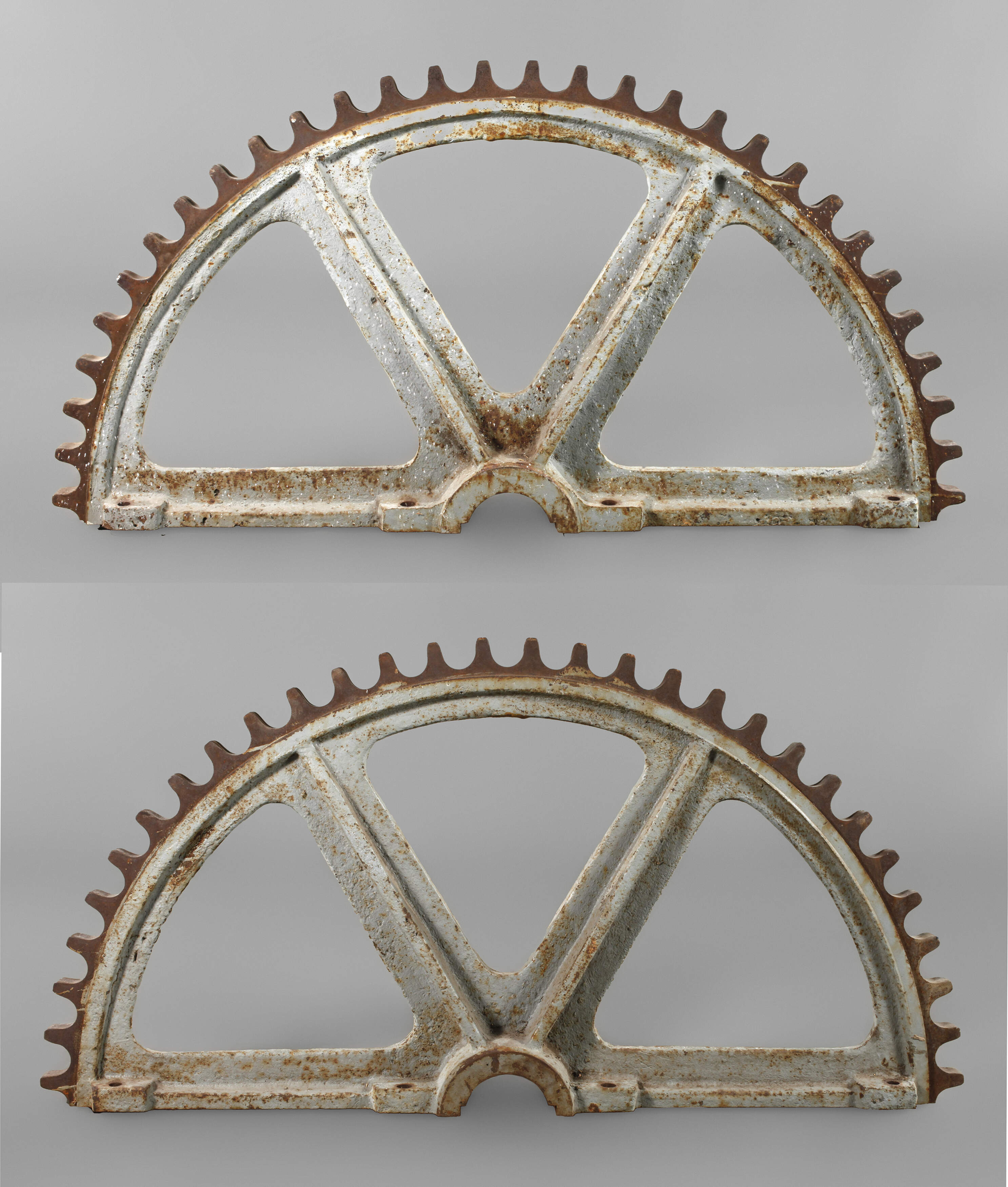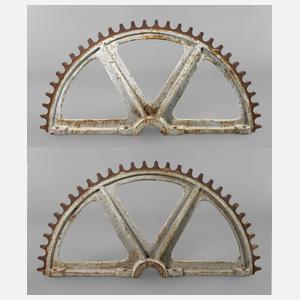 Ende 19. Jh., Eisenguss grau gefasst, ehemals zweiteilig verschraubt, Oberfläche mit Altersspuren, Maße je 75 x 150 x 18 cm.
