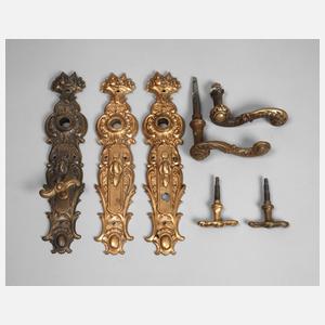 Bronze gegossen, um 1890, zwei Stück vergoldet, dazu zwei Klinken und drei Wirbelgriffe, L 30 cm, Dornmaß 7 cm.