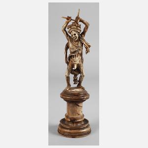 wohl 19. Jh., Horn aufwendig beschnitzt, vollplastische Gestalt eines wilden Mannes auf gedrechseltem Eichenholzsockel, Altersspuren, kleinste Substanzverluste, H 22 cm.