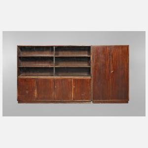 Entwurf um 1928, rückseitig gemarkt mit Brandstempel der Bauhochschule Weimar, Mahagoni auf Nadelholz furniert, originale Glasscheiben, Schlösser und Schlüssel, kleine Furnierfehlstellen, rest.bed., Maße Schrank 150 x 97 x 38 cm, Vitrine 151 x 196 x 38 cm.