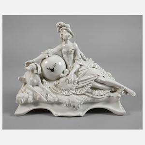 Entwurf Paul Scheurich 1937, unterglasurblaue Schwertermarke nach 1947, einmal gestrichen und Weißschnitt, Modellnummer 60833, Bossierernummer 109 und Jahreszeichen für 1958, naturalistische Ausformung in Weißporzellan, auf oblongem Podest neben einer Kugel mit reliefiertem Ziffernblatt ruhende Dame im Rokokostil mit einer entblößten Brust und Federhut, unter ihrem voluminösen Kleid der abgelegte Bogen und Köcher sichtbar sowie einen Jagdhund auf der anderen Seite der Kugel streichelnd, seltenes Uhrengehäuse mit Kienzle Quarzwerk und gebläuten Zeigern, Werk läuft an und ein Damenfuß sauber geklebt, sonst guter Zustand, Maße max. 13,5 x 36 x 17 cm. Quelle: Bergmann, Meissener Künstler-Figuren, Band I, S. 521, Abb. 1054.