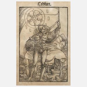 stattlicher junger Mann vor Stadtansicht, gekleidet in der Mode der Zeit, beim Schwingen einer Fahne und hierauf das Stadtwappen von Erfurt, oberhalb der Darstellung bezeichnet "Erdfurt.", erschienen im Jahr 1579 in "Wapen, Des heiligen Römischen Reichs Teutscher Nation, als Keyserlicher und Könglicher Mayestat, auch der ChurfürstenWapen, Des heiligen Römischen Reichs Teutscher Nation, als Keyserlicher und Könglicher Mayestat, auch der Churfürsten..." auch genannt Fahnenbuch, Holzschnitt, im Stock monogrammiert "IK", rückseitig wohl weiterer Holzschnitt, etwas gebräunt, unter Passepartout und hinter Glas gerahmt, Darstellungsmaße ohne Schrift ca. 22 x 14,5 cm. Künstlerinfo: schweizerischer Maler und Holzschneider (um 1500 wohl Bern bis 1565), fertigte unter anderem Holzschnitte zu/für Giovanni Boccaccios, Apiarius, Johannes Pauli, Quelle: Thieme-Becker und Wikipedia.