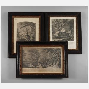 Wildschwein auf der Flucht, Parforcejagd und sich aufbäumender Hirsch, unter der Darstellung jeweils Beschreibung des Dargestellten, Kupferstiche, jeweils in der Platte bezeichnet "J. E. Ridinger del. sculps. ed. excud." sowie zwei Arbeiten datiert "1742" und "1753", ein Blatt späterer Abzug, unter Glas gerahmt, Darstellungsmaße ohne Schrift ca. 25,5 x 27 cm. Künstlerinfo: dt. Maler, Graphiker und Verleger (1698 Ulm bis 1767 Augsburg), Schüler seines Vaters Johann Ridinger, ab ca. 1711 Schüler des Malers Christoph Resch in Ulm, ab 1713-14 bei Johann Falch in Augsburg, durch Vermittlung von Gabriel Spitzel drei Jahre im Diensten Graf Metternichs in Regensburg, ab ca. 1718 Schüler der Augsburger Stadtakademie bei Georg Philipp Rugendas dem Älteren, hier 1757 zum “Assessor des evangelischen Ehegerichts” und 1759 zum Direktor der Stadtakademie ernannt, wurde durch Tier- und Jagddarstellungen berühmt, die einen Hauptteil seines Schaffens ausmachten, Quelle: Thieme-Becker, Wikipedia und Internet.