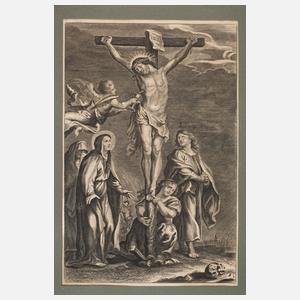 der leidende Christus am Kreuz und zu seiner Seite ein Engel, welcher das Blut aus seiner Wunde in einem Kelch auffängt, am Fuß des Kreuzes stehen unter anderem trauernd Maria, die Mutter Mariens Anna und Maria Magdalena, effektvolle Heiligendarstellung, Kupferstich, um 1700, gleichmäßig leicht gebräunt, unter Passepartout und hinter Glas gerahmt, Darstellungsmaße ca. 26 x 17 cm.