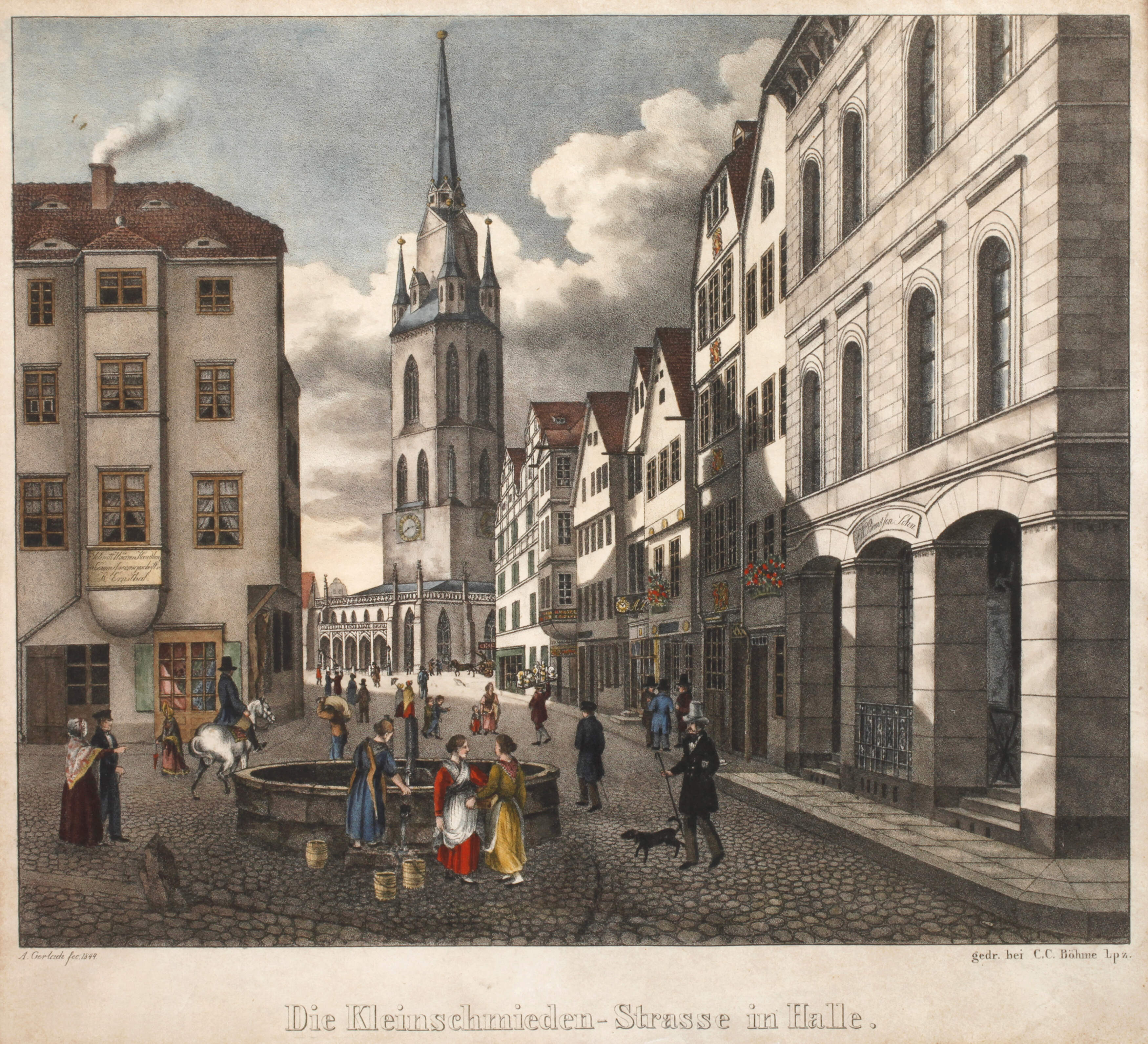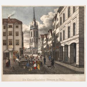 Blick entlang der belebten Straße in Halle auf den Markt mit dem Roten Turm, unter der Darstellung betitelt "Die Kleinschmieden-Srasse in Halle", teils kolorierte Lithographie, unter der Darstellung links bezeichnet und datiert "A. Gerlach fec. 1844" sowie rechts "gedr. bei C. C. Böhme LPZ (Leipzig)", etwas gebräunt und fleckig, unter Passepartout und hinter Glas gerahmt, Darstellungsmaße ohne Schrift ca. 24 x 28,5 cm.