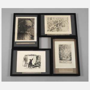 bestehend aus Hermann Struck, "Alter Jude aus Jaffa", Druck nach Radierung; Max Slevogt, "Der Bildermann", Lithographie; Max Liebermann, "Amsterdamer Judengasse", Radierung und Hans Meid, "Der Maler in der Landschaft", Radierung, um 1910-20, jeweils hinter Glas gerahmt, Darstellungsmaße max. ca. 16 x 10,5 cm.