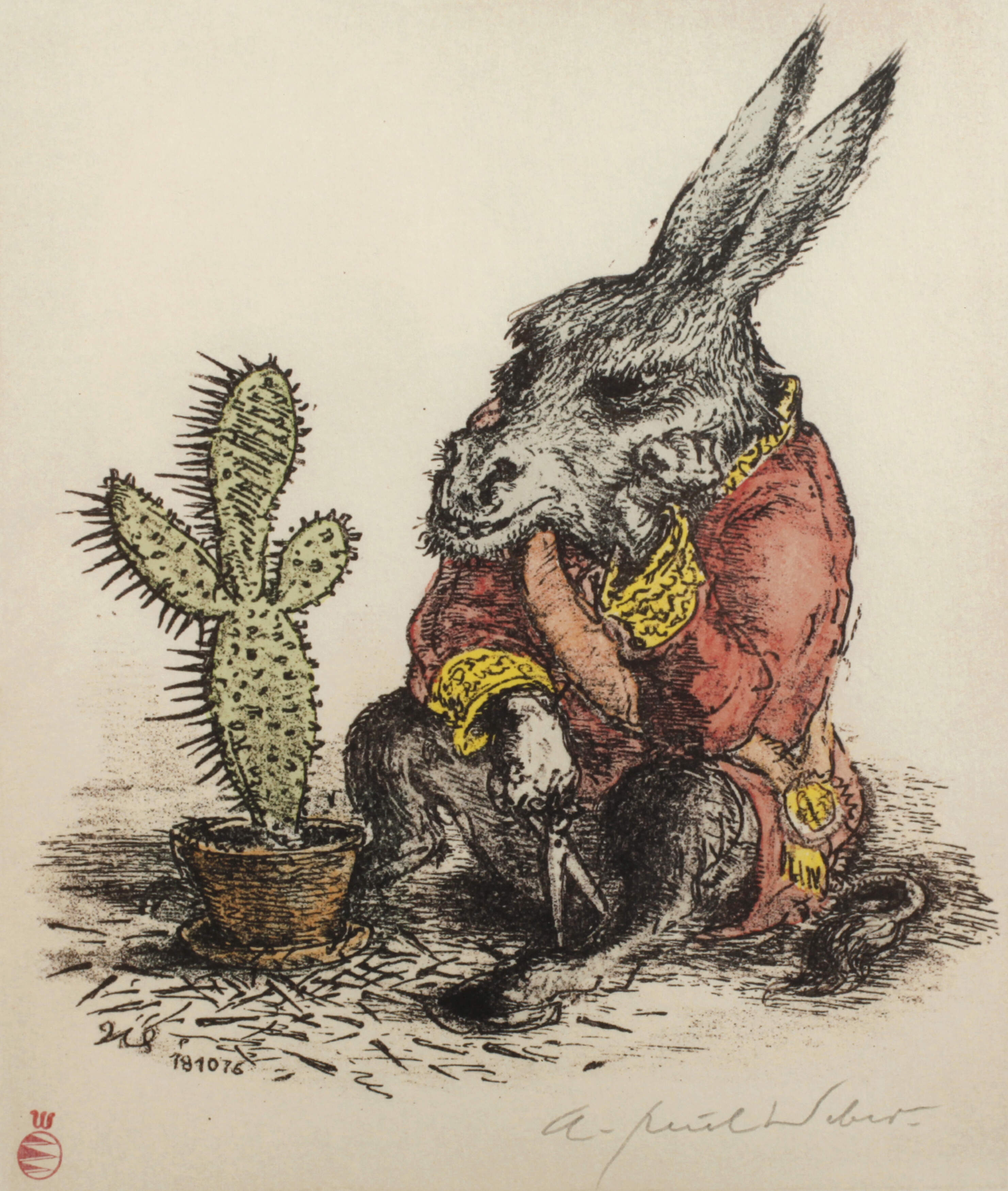Esel beim Abschneiden von Stacheln eines Kaktus nachsinnend, erschien als Vorzugsarbeit zum Kritischen Kalender auf das Jahr 1977, Farblithographie, unter der Darstellung rechts in Blei signiert "A. Paul Weber", links unten Stempel der Clan-Presse in Rot, im Druck ligiertes Monogramm und Nummer "191076", unter Passepartout und hinter Glas gerahmt, Darstellungsmaße ca. 19,5 x 16,5 cm. Künstlerinfo: Künstlername "A. Paul Weber", dt. Zeichner, Maler, Illustrator und Graphiker (1893 Arnstadt bis 1980 Schretstaken), studierte an der Kunstgewerbeschule Erfurt, ab 1916 als Zeichner und Karikaturist tätig, 1925 Gründung der “Clan-Presse”, 1928 Anschluss an den “Widerstandskreis” und Mitherausgabe der 1931–36 erscheinenden Zeitschrift “Widerstand”, deswegen 1937 Verhaftung und Arbeitsbeschränkung, nach 1945 wieder zeitkritische Graphiken unter anderem für die “Griffelkunstvereinigung Hamburg”, 1959–80 Herausgeber des “Kritischen Kalender”, 1971 Ernennung zum Professor, tätig in Berlin und Schretstaken, Quelle: Thieme-Becker, Vollmer, Wikipedia und Internet.