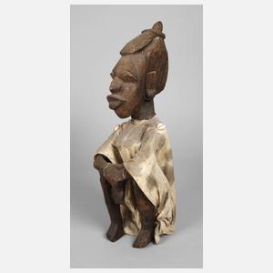 wohl Haiti, 20. Jh., dunkles Tropenholz beschnitzt, in abstrahierender Formsprache gestaltete Sitzfigur mit angezogenen Knien und stark stilisierten Gesichtszügen, bekleidet mit Gewand aus hellem Leinen, verziert von Kaurischnecken, Altersspuren, partiell alt repariert, kleine Substanzverluste, H 48 cm.